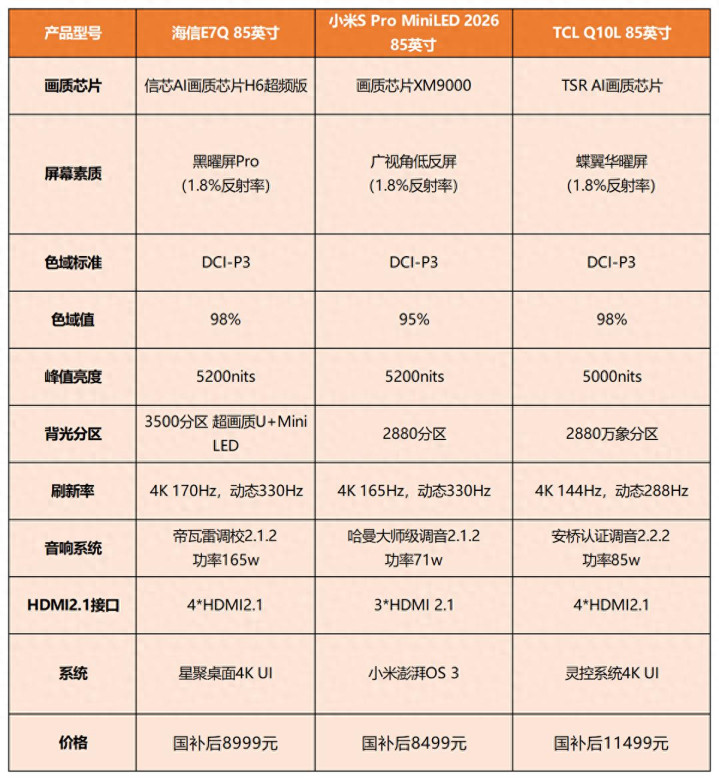 今年的双十一早早就来了,京东10月9号就开始,整个周期37天;淘宝天猫也没闲着,10月15号就紧跟着启动。这期间优惠力度是真的大,尤其像家电这种大件,特别适合入手。前几天跟几个朋友聊天,不知怎么就聊到了买电视上,你猜怎么着?没说两句,几个人就争起来了。一个朋友强烈推荐海信E7Q,说看电影、打游戏都特带劲,质价比最高;另一个位不服,说小米S Pro MiniLED 2026配置均衡,用着顺手;还有个朋友更直接,掏出手机就给我们看TCL Q10L,夸它外观不错。