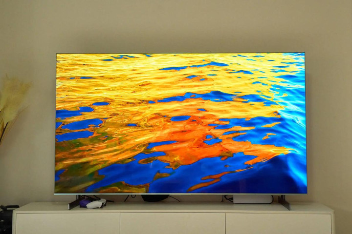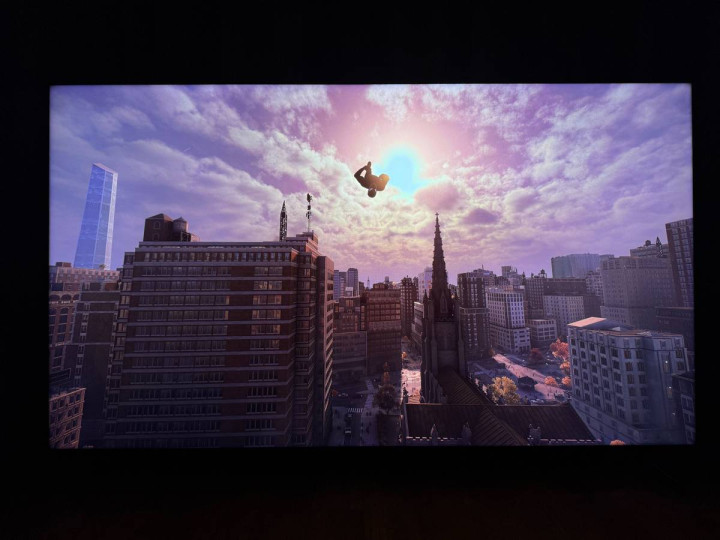 屏幕用的是自家的蝶翼华曜屏,实测反光率大概在1.8%左右。白天客厅开着灯看,画面也依然清晰,不会泛白或模糊。参数上也不弱,85英寸版有2880个物理背光分区,峰值亮度达到5000nits,平时追剧看综艺,色彩饱满、亮度也足够。